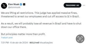 Mas os princípios são mais importantes do que o lucro – bancou o dono da rede social X.
