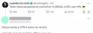 Por volta das 10h desta segunda-feira (8), Grilo postou uma mensagem em sua conta no X questionando se usuários que estavam no Brasil naquele momento conseguiam visualizar o post sem o uso de VPN — sigla para virtual private network, tecnologia que permite burlar a localização do usuário ao simular uma conexão a partir de outro país.
