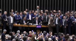 A cena aconteceu enquanto o presidente da Câmara tentava realizar a sessão marcada para esta quarta, mesmo sob ocupação. A polícia legislativa chegou a ser posicionada na porta do plenário, e Motta havia ameaçado suspender o mandato de quem impedisse a sessão.