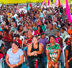 A noite também foi marcada por momentos de louvor com a cantora Naara Aguiar, além de sorteio de brindes, distribuição de presentes e cestas básicas destinadas às mães presentes no evento.