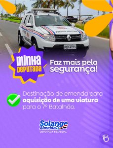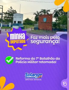 Além da obra, Solange Almeida informou que também destinou emenda parlamentar para a aquisição de uma nova viatura para o batalhão, reforçando a estrutura operacional da Polícia Militar. Segundo a deputada, a entrega do veículo deverá acontecer em breve.
