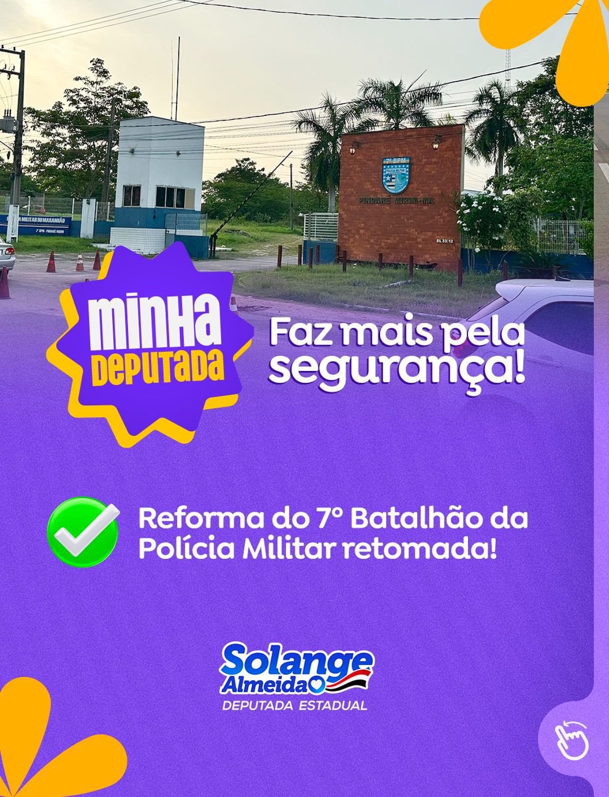 A deputada Solange Almeida segue fortalecendo ações voltadas para a segurança pública na região. Em publicação recente, a parlamentar anunciou a retomada da reforma do 7º Batalhão da Polícia Militar de Pindaré-Mirim, atendendo a uma demanda importante para melhorar as condições de trabalho dos policiais e o atendimento à população.
