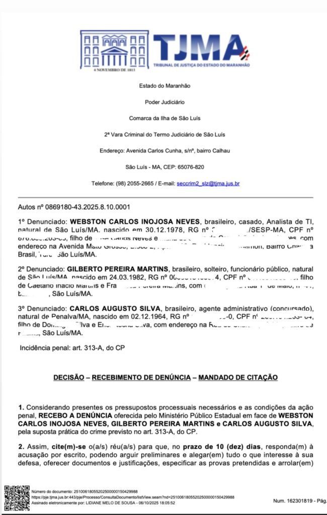 A denúncia foi aceita pela juíza Lidiane Melo de Souza, da 2ª Vara Criminal de São Luís, em 6 de outubro de 2025, que determinou a citação dos acusados e o prosseguimento da ação penal.