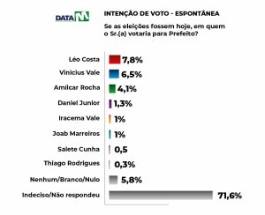 No questionamento de intenção de voto espontâneo: “Se as eleições fossem hoje, em quem você votaria?” O pré-candidato Léo Costa obteve 7,8%, Vinicius Vale ficou com 6,5%, Amílcar Rocha com 4,1%, Daniel Júnior com 1,3%, seguido de Iracema Vale e Joab Marreiros que aparecem com 1% cada um. Salete Cunha teve 0,5% e Thiago Rodrigues 0,3%. Neste quesito de declaração espontânea de votos, 71,6% dos entrevistados estão indecisos e/ou não responderam, e 5,8% são os que escolheram nenhum, branco e nulo.