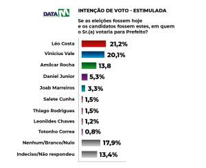 Na pergunta Estimulada: “Se as eleições fossem hoje e os candidatos fossem estes, em quem você votaria para prefeito?” O Léo Costa aparece com 21,2%, Vinicius Vale com 20,1%, Amílcar Rocha tem 13,8%, Daniel Júnior apresenta 5,3%, Joab Marreiros com 3,3%, Salete Cunha e Thiago Rodrigues, mesma porcentagem de 1,5% , Leonildes Chaves 1,2% e Totonho Correa 0,8%. Nenhum, branco e nulo totalizam 17,9%, indecisos e não responderam 13,4%.