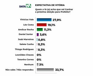 Perguntados, “independentemente em quem você vai votar, quem você acha que vai vencer a próxima eleição para prefeito”, Vinicius Vale foi apontado por 27,9%, seguido de Léo Costa com 19,1%, Amílcar Rocha com 11,3%, Daniel Júnior 3,6%, Joab Marreiros 0,8%, Salete Cunha e Thiago Rodrigues 0,3%, nenhum dos pré-candidatos 3% e não sabem ou não opinaram 33,7%.