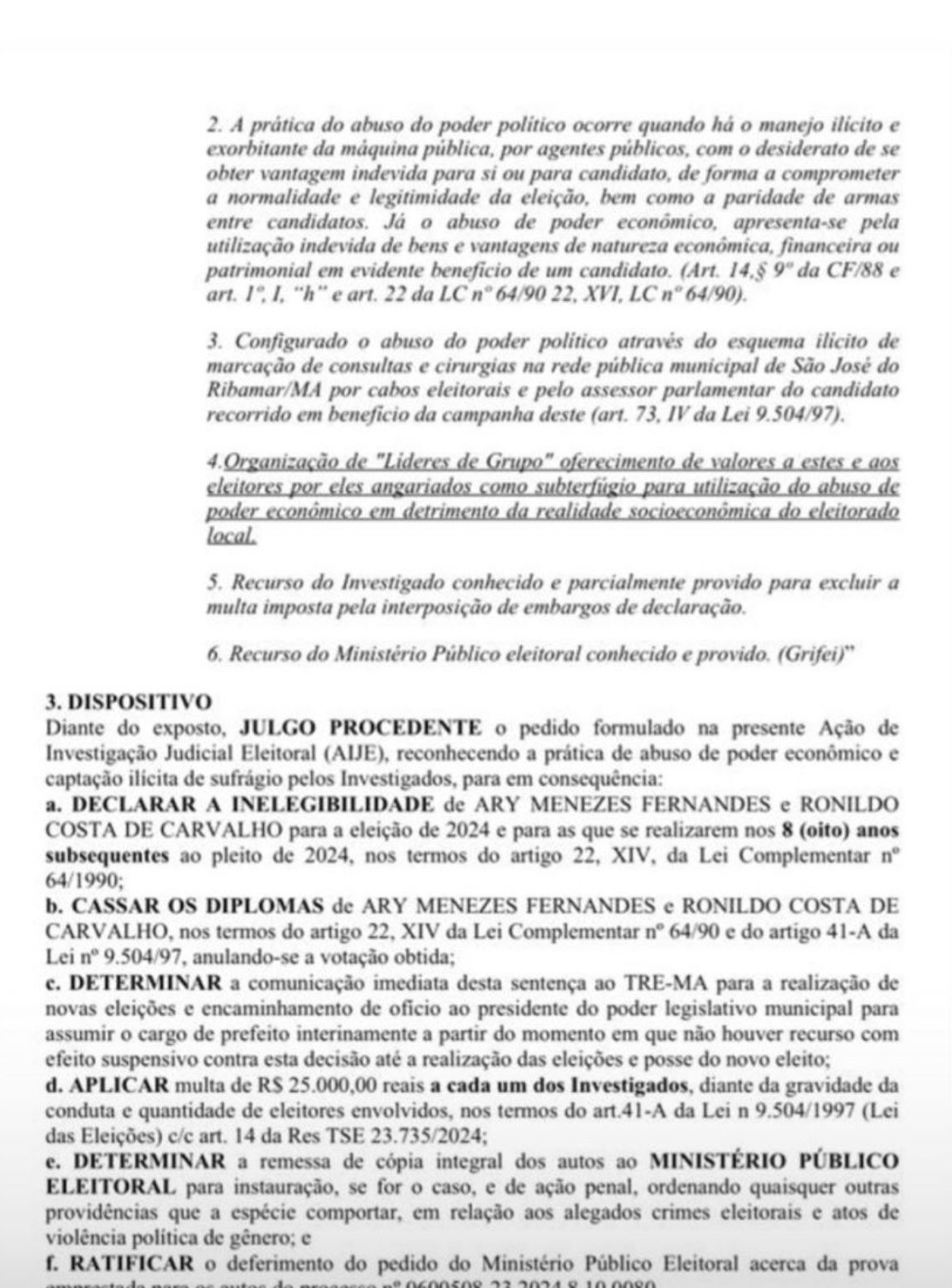 A Justiça Eleitoral determinou a cassação dos diplomas do prefeito Ary Menezes e do vice-prefeito de Nova Olinda do Maranhão, em decisão que também comunicou o Tribunal Regional Eleitoral do Maranhão (TRE-MA) para providenciar a realização de uma nova eleição no município.