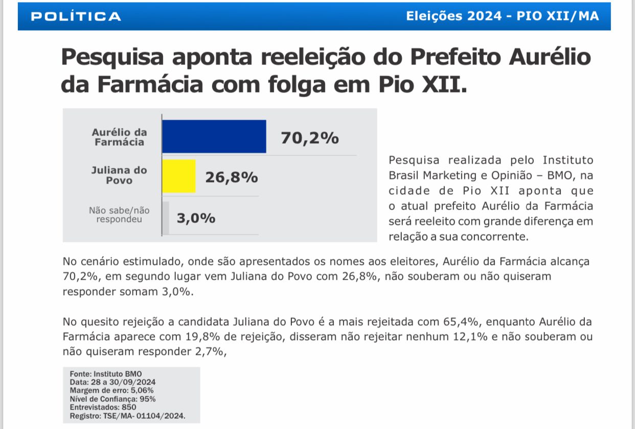 Em direção à vitória, Aurélio da Farmácia, Prefeito do município de Pio XII, caminha a passos largos rumo à reeleição. A mais recente pesquisa de intenções de votos constatou que o atual chefe do executivo possui larga vantagem de 70,2% à frente de sua concorrente. Com 859 pessoas ouvidas, a apuração, que possui nível de confiabilidade 95% e margem de erro de 5,06%, foi realizada entre 28 e 30 de setembro pelo Instituto Brasil Marketing e Opinião (BMO).