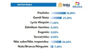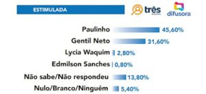 No cenário estimulado, quando os candidatos são apresentados aos entrevistados, Paulinho aparece 45,60% das intenções de voto, isolado na liderança das intenções de voto.
