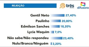 O mais rejeitado foi o candidato Gentil Neto (PP), com 27,40%. Por outro lado, Paulinho (PL) teve 20,80% de rejeição.