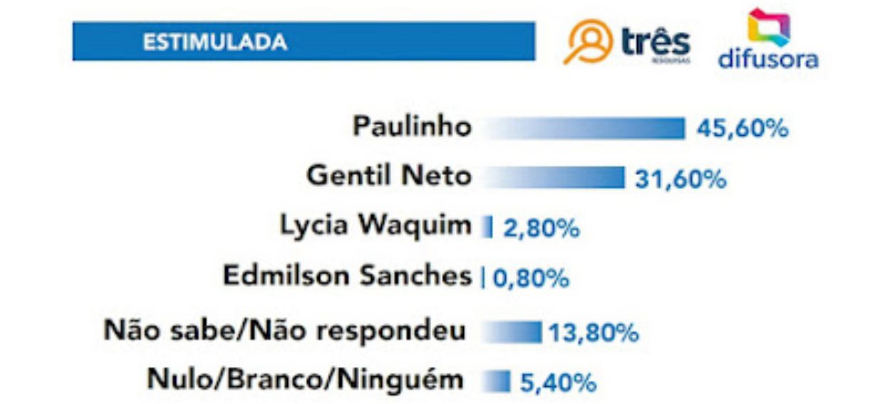 No cenário estimulado, quando os candidatos são apresentados aos entrevistados, Paulinho aparece 45,60% das intenções de voto, isolado na liderança das intenções de voto.