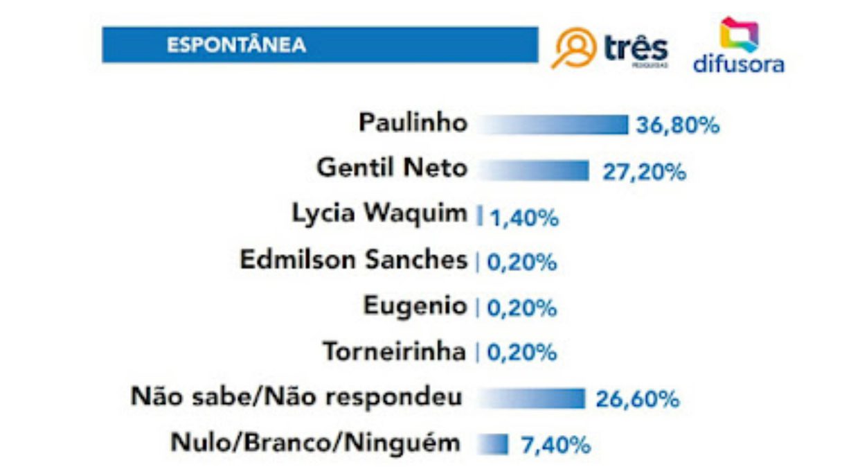 O mais rejeitado foi o candidato Gentil Neto (PP), com 27,40%. Por outro lado, Paulinho (PL) teve 20,80% de rejeição.
