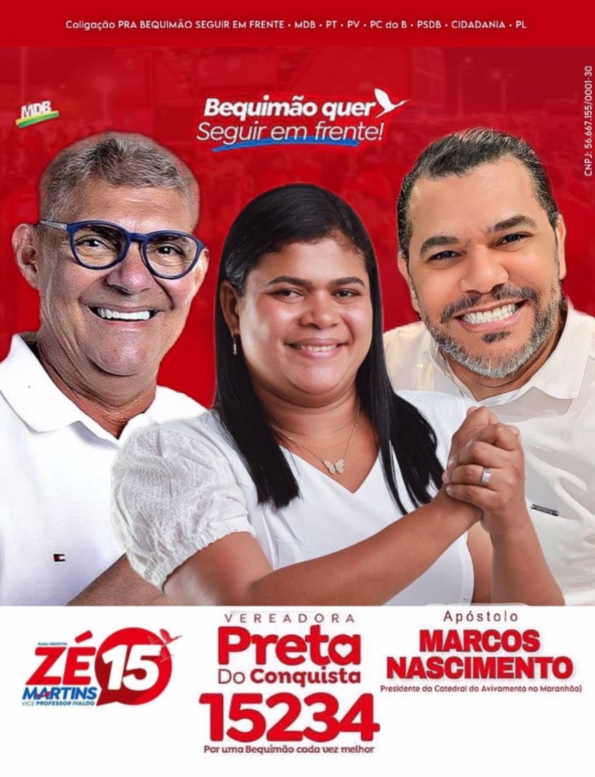 Com a proximidade das eleições, a candidatura de Preta do Conquista ganha mais força, pois suas ações como conselheira tutelar são lembradas pelo povo, e suas atitudes e preocupações atuais com o desenvolvimento social e econômico da cidade firmam uma aliança que resultará em vitória. A luta de Cirlene é justamente essa, lutar por uma Bequimão cada vez melhor!