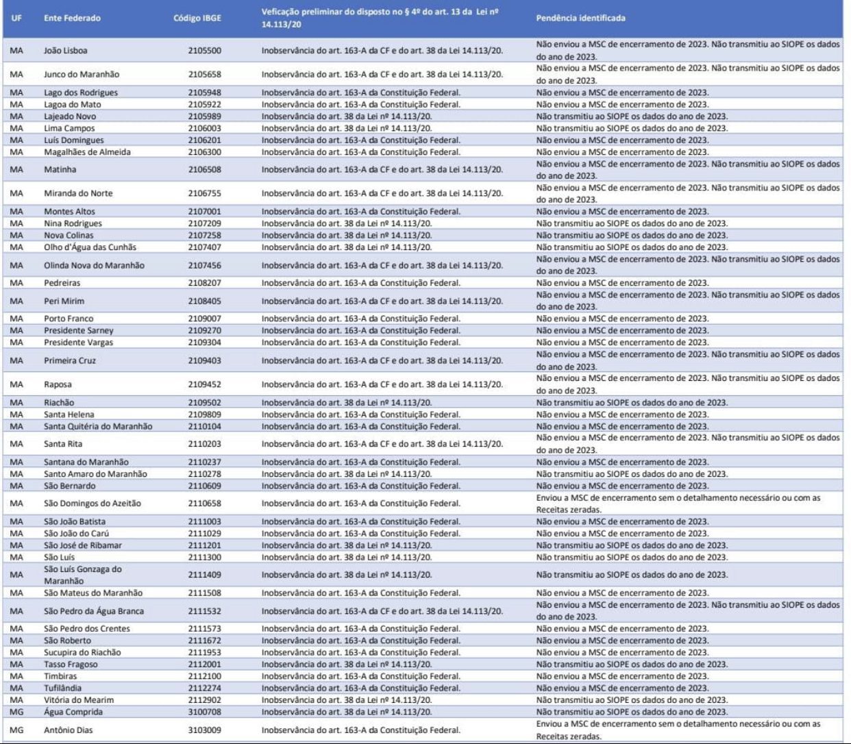 O Tesouro Nacional e o Fundo Nacional de Desenvolvimento da Educação (FNDE) divulgaram a primeira prévia dos entes inabilitados a receber a complementação do recurso. 1.580 entes da Federação não foram habilitados porque não enviaram a Matriz de Saldos Contábeis (MSC) de encerramento do exercício do ano de 2023. Na Baixada maranhense, Viana foi o único a cumprir os requisitos, que incluem a observância ao artigo 163, da Constituição Federal, e o artigo 38, da Lei 14.113/20.